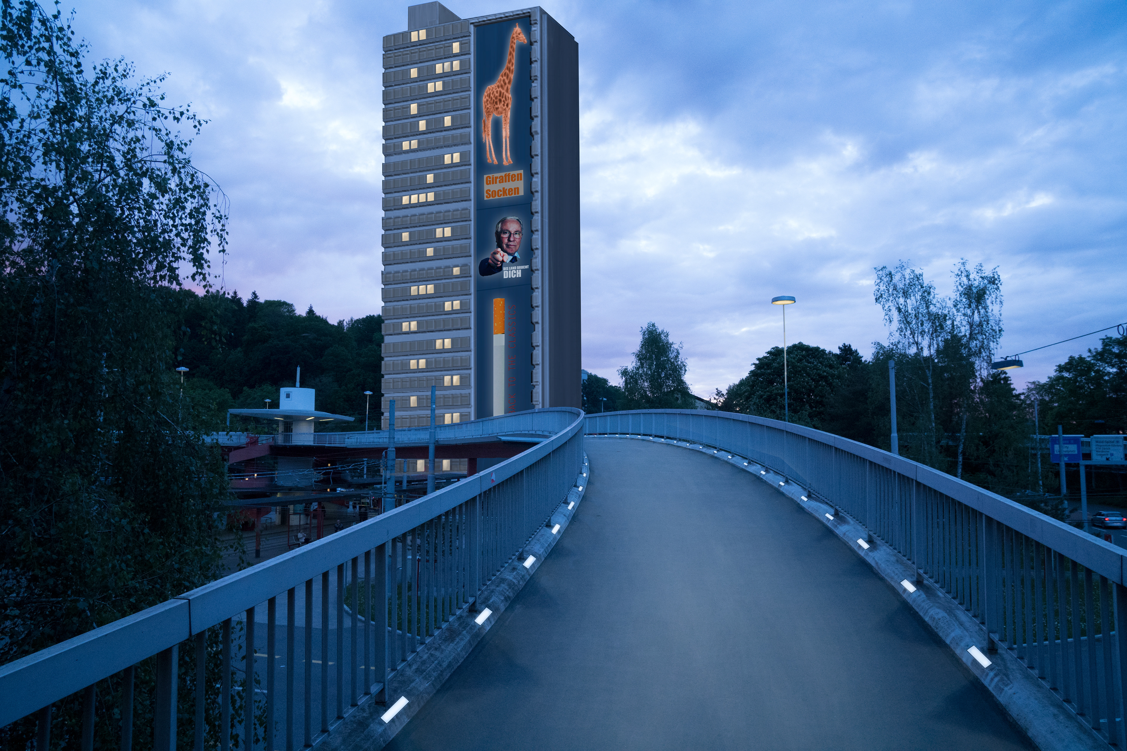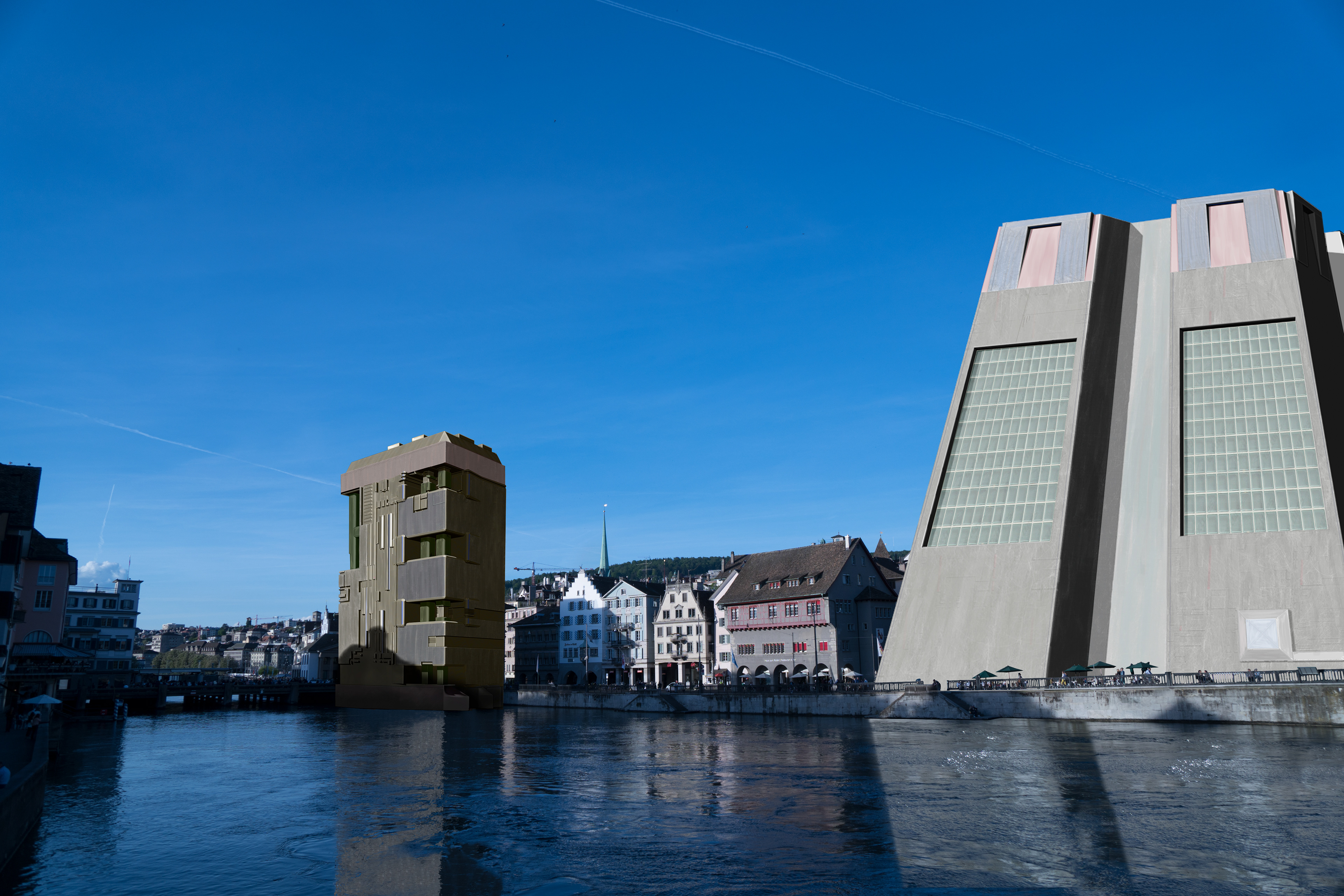A series of images depicting architectural additions to Zurich in 2041. The images are compositions of photographs of Zurich, models created in Zbrush and textures painted in Photoshop